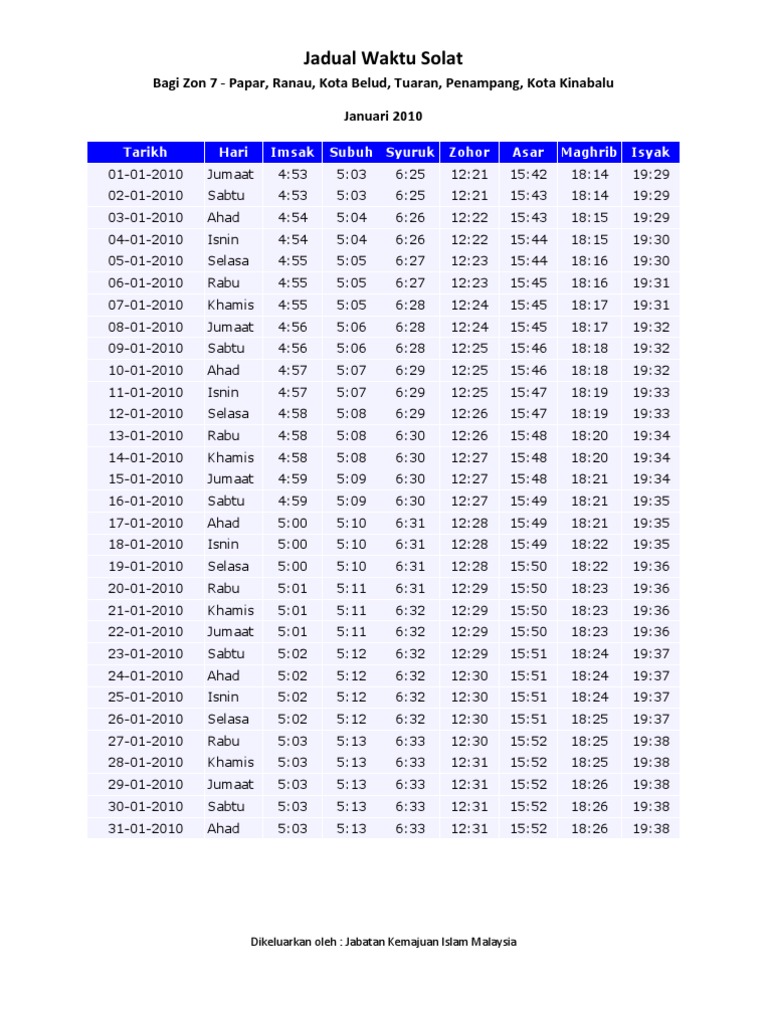 Waktu Solat Kota Kinabalu Ranau Kota Belud Tuaran Penampang Papar Putatan Bahagian Pantai Barat